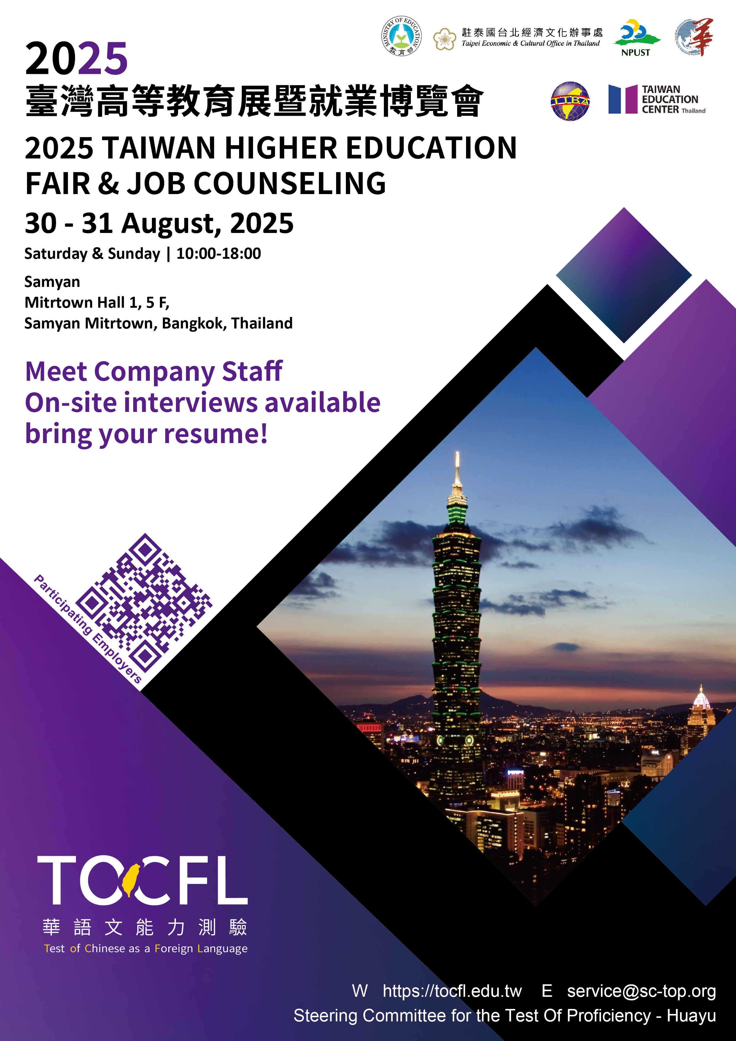 「2025泰國臺灣高等教育展暨就業博覽會」將擴大辦理企業徵才,共有12家於泰國投資之臺商企業徵求具中文能力之各領域人才,敬請泰籍畢業校友踴躍參加。